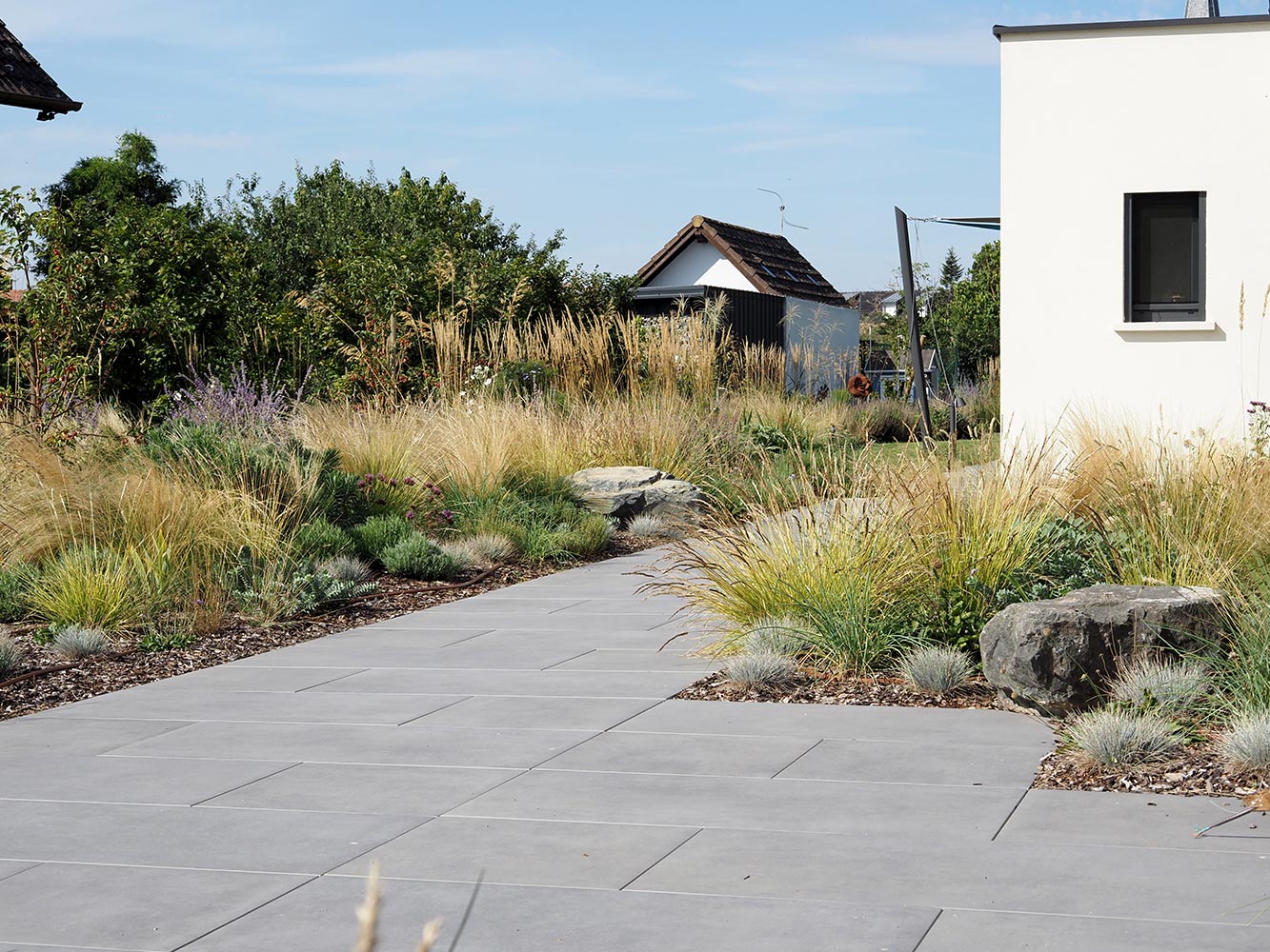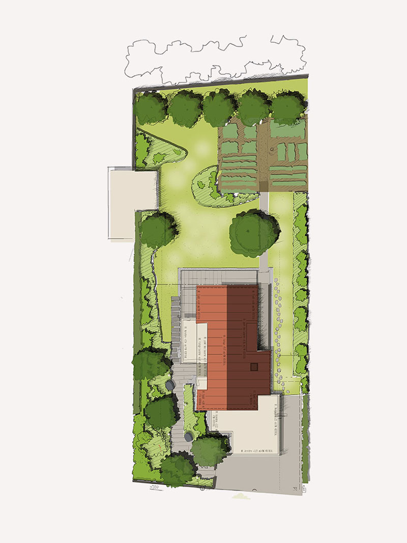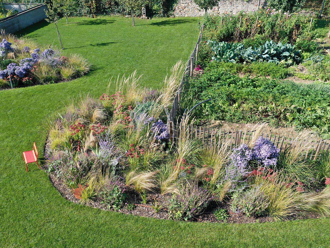 Le plan de conception a structuré l’ensemble en zones distinctes et complémentaires. Un vaste potager productif et un petit verger aux lignes épurées côtoient des massifs luxuriants de vivaces et de graminées. Cette composition réfléchie crée des ambiances variées, favorisant la biodiversité tout au long de l’année. La grande pelouse centrale, les terrasses modernes en dalles grises et les cheminements dessinent les axes de l’espace, tandis que des roches et des ganivelles en bois apportent du caractère et de la texture.