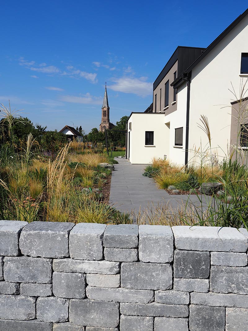 Au cœur de ce projet se trouve la conservation et la mise en valeur du mur historique du village. Cette intégration délicate de l’héritage local au sein d’un aménagement moderne reflète notre profond respect pour l’identité et le passé des lieux. Le résultat est un jardin qui s’intègre avec finesse au paysage alsacien, offrant un cadre de vie exceptionnel et durable.