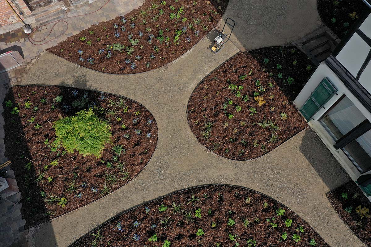 Pour préserver l’intimité, nous avons créé une barrière visuelle élégante. Des lignes d’arbres en rideau, préformées par notre pépiniériste, ont été plantées pour isoler le jardin du cimetière adjacent. Le résultat est un lieu où, depuis le salon, les terrasses ou la placette, on se sent désormais enveloppé par la vie et la nature.