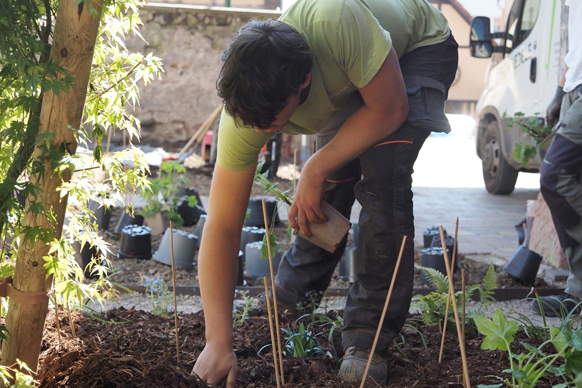 Le choix des plantations a été méticuleux, adapté à l’ombre et au sol très argileux. Nous avons sélectionné des Carex, Hakonechloa et Bergenia, complétés par des narcisses pour une touche de couleur printanière. Pour enrichir le sol, un apport d’humus et un paillage d’écorce ont été utilisés, facilitant ainsi l’entretien et favorisant la vie du sol.
