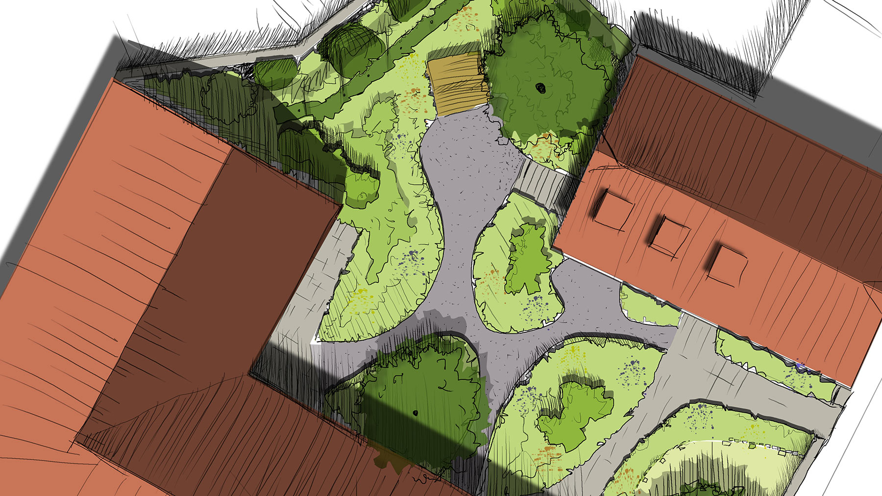 Notre proposition : supprimer le gazon pour fluidifier les parcours. Des massifs aux courbes dynamiques sont soulignés par des voliges en acier. Un gravier aux nuances spécifiques assure la transition chromatique avec le pavage existant.